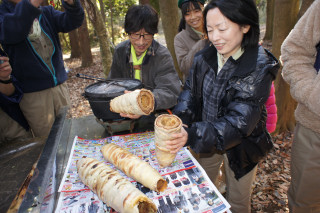 今回挑戦したのは、竹を使ったバウムクーヘン作りです。せっかくのクリスマスだから、 みんなにおいしいケーキを振る舞おうと、みんなで頑張りました。