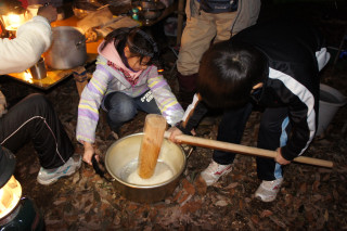 今回は、私としては、初めてキャンプで餅つきに挑戦してみました。初めてにしては上出来だったと思います。 お手製の杵に、アルミ鍋の臼。こんな餅つき、なかなか体験できないよね。しかも寒すぎて、餅はどんどん硬くなって いくし。面白かったです。