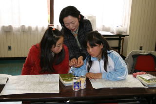 | ●サイコロ?ゲーム。勝ったのは、TKMチーム! | ●コンパスを使って磁北線を引きます。 | ●地図記号覚えたかな? |