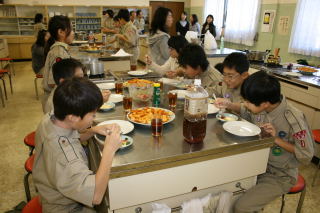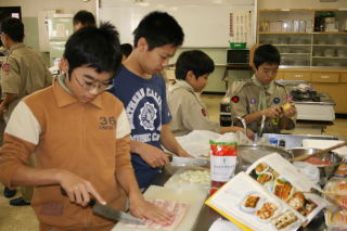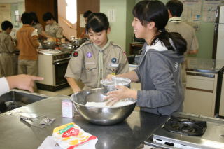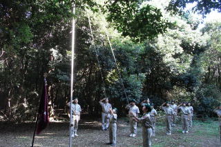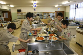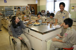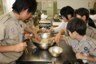 初日は、設営とキャンプファイアを行い、先輩と新入の親睦を深め合いました。いつもは、苦労する食事
