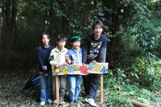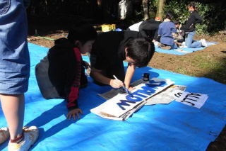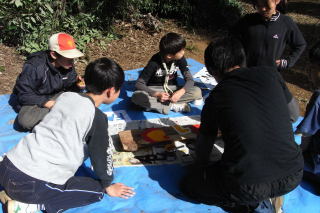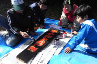 この日のプログラムは、班サイトおよびゲートの看板作りです。各班で相談しながら、杉板にデザインし、