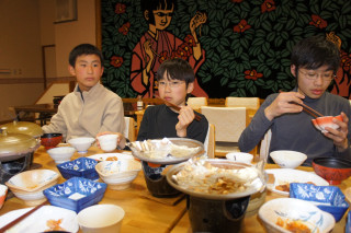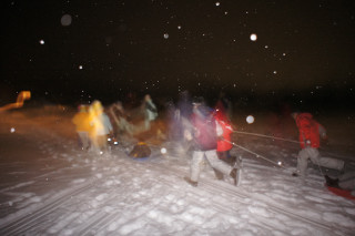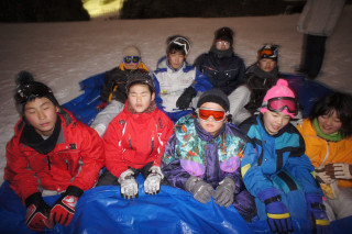 2日目の夜は、恒例のブルーシート滑りをしました。雪が降っていて、滑りずらかったので、 徐々に上に上がっていき、結局、男坂(中級の斜面)の上から滑りました。上まで登るのも 大変でしたが、その滑りもかなり激しく、ちょっとしたジェットコースターよりも怖かった かもしれません。雪は頭からかぶるしで、大変でしたが、とっても楽しかったですね。