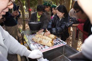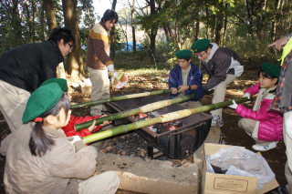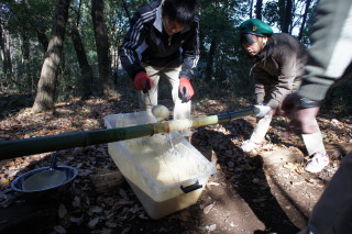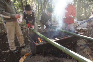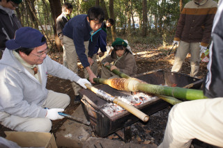 今回挑戦したのは、竹を使ったバウムクーヘン作りです。せっかくのクリスマスだから、 みんなにおいしいケーキを振る舞おうと、みんなで頑張りました。