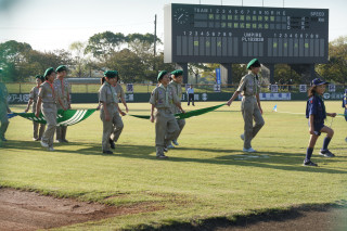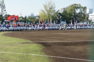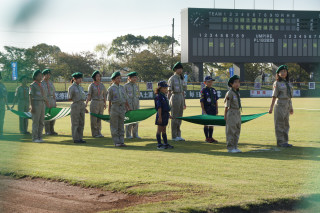 10月21日に、少年野球大会の開会式の奉仕を行いました。みんなは、大きな旗を持って行進しました。