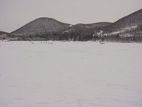 一方釣り組は、スケートリンクの先にテントを3つ張り、どりるで穴をあけて釣っていた。OG9織田倉がゲームボーイの魚探を持ってきたので今回は釣果が期待できる。食料をすべて釣り現場に持って行かれてしまったので、8時すぎに起きだし、強力火力のピーク1を修理して、津野場に向かう。その時点で竿頭はOG2海老原副長の6匹、続いてOG9織田倉の3匹でそれにOG6成毛が続く。奴隷組は市川候補が1匹で、OG10村田と望月候補の2人はボーズなのであった。カップラーメン2つとパンで朝飯をとる。寒い中での暖かいカップラーメン、こいつはとびきり美味いのだ。そのアトも釣りを続けるが食いはほとんど止まってしまった。そしてお昼前に撤収を決めサイトに戻ることとなった。