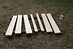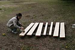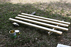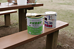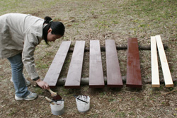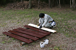 | 1.まず木材の防腐剤を塗ります。 今回は透明の防腐剤を使用しました。 | 2.丸太を台にして、板を並べます。 | ||||||||||||||||||||||||||||||||||||||||||||