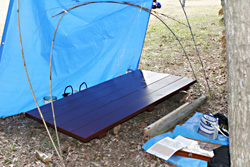 | 5.乾くまで1時間。そして板を合わせて 後ろから2×4を当ててビスで固定します。 | 6.あて板にも塗料を塗って、完全に乾く まで1晩おきます。その辺にある篠を支柱 にブルーシートで覆いを作りました。 | ||||||||||||||||||||||||||||||||||||||||||||