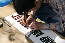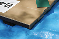 | 7.支柱にも防腐剤を塗っておきます。 | 8.ここから翌日です。看板の表全体を ガムテープで覆います。そこにシールラベル に印刷した文字をきちんと貼り付けます。※1 | ||||||||||||||||||||||||||||||||||||||||||||