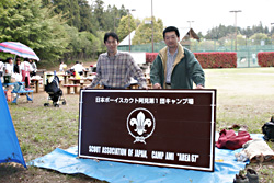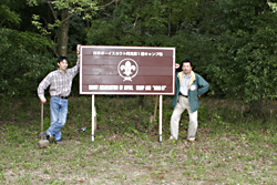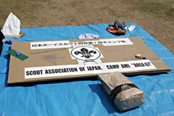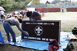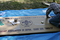 ※1 文字は、パソコン(ADOBE ILLUSTRATOR)で、原寸大に拡大して、それを部分的にA4用紙に印刷しました。また、位置決めをきちんとできるように、文字に並行に3本のガイドラインを入れて印刷しました。(3cmグリッドの方が良かったかもしれません。) ※2 作業は平成18年4月29日・30日に新キャンプにおいて、阿見1ベンチャー隊の他に、カブ隊の小峰副長、取手2団の杉浦ボーイ隊副長の協力で行いました。 ※3 最終の仕上げ作業は平成18年5月4日に、若泉団委員長、遠藤団委員、佐藤副長、中島隊長が行いました。 | |||||||||||||||||||||||||||||||||||||||||||||