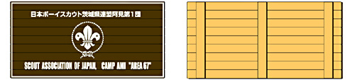 2006年2月、阿見第1団のキャンプ場用として阿見町から町有地を借りることになり、正式に許可が下りた。借りるにあたっての条件として土地の周囲の境界の柵を設けることと「阿見第1団キャンプ場」看板を立てることを申し渡された。そこで、ベンチャー隊では、隊員のプロジェクトの一環として看板を作成することとした。 これは、その作成の記録である。 作成にあたって、隊長から指示があったのは、たった3つである。 ・期限は、4月中。 ・費用は、できる限り安価で ・体裁は、できる限り質感を大事に、また「おっ」と唸るデザインのものを まぁ、十分過ぎるほどの要求であった。 まず、看板の大きさは、畳1畳とすることにした。次に看板の板だが、価格的には耐水ベニヤやコンパネだが、質感がチープであるため却下された。1枚板は高価で手が出ない。そこで、最近安く出回っている2×4材を使うことにした。これだと厚さが38mmもあるし、必要数20本を買ったとしても4000円ちょっとである。 早速、それをもとにデザインに入った。要求が「おっ」と唸るデザインである。ありきたりのデザインではベンチャー隊の名がすたる。考えに考えた結果、下のデザインで行くことになった。同時に設計図も起こした。 ![]() そして、材料を買い出しに行った。行ったホームセンターで2×4材を見ると角が面取りしてあり継ぎ目にあたると文字を書くときによろしくない。そこで、本体部分は若干高くなるが幅が倍の2×8材に替えることにした。それ以外は予定通りである。 買った材料は以下の通り。
