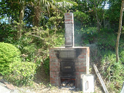 ・・・・と思ったのですが、5月3日に知人の石窯を実際に見せていただきました。その時に、その設計者の亀田さん(その道のプロ)にいろいろとお話を伺い、設計図をいただけることになりました。また、材料は石塀として使っていた大谷石を譲り受けてそれで作ったらどうか・・・とのアドバイスもいただきました。どうせ作るからにはいいものを!! です。 ということで、Mickeyはあっさりとお蔵入りしてしまいました。ベンチャー隊らしいですね。 写真はその石窯です。追い焚き、薫製可能なものです。(これだけのものを見せつけられると、ちょっと・・・いや、相当くやしいっス!!) | |